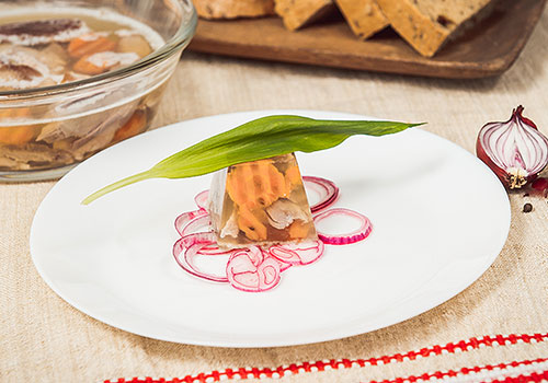Domáca huspenina ako zdravý liek z bravčového mäsa, očisteného cesnaku, mrkvy dochutená čiernym korením a soľou. Servírovaná s octom a cibuľou, ideálne obohatená a dozdobená medvedím cesnakom.