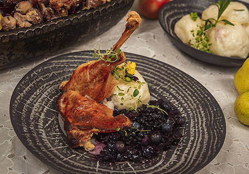 Osolená hus pečená do chrumkava na 180 °C s tymianom a podliata červeným vínom. Podávaná s knedľami, dusenou červenou kapustou a hruškami.