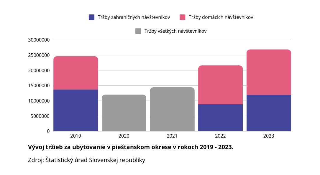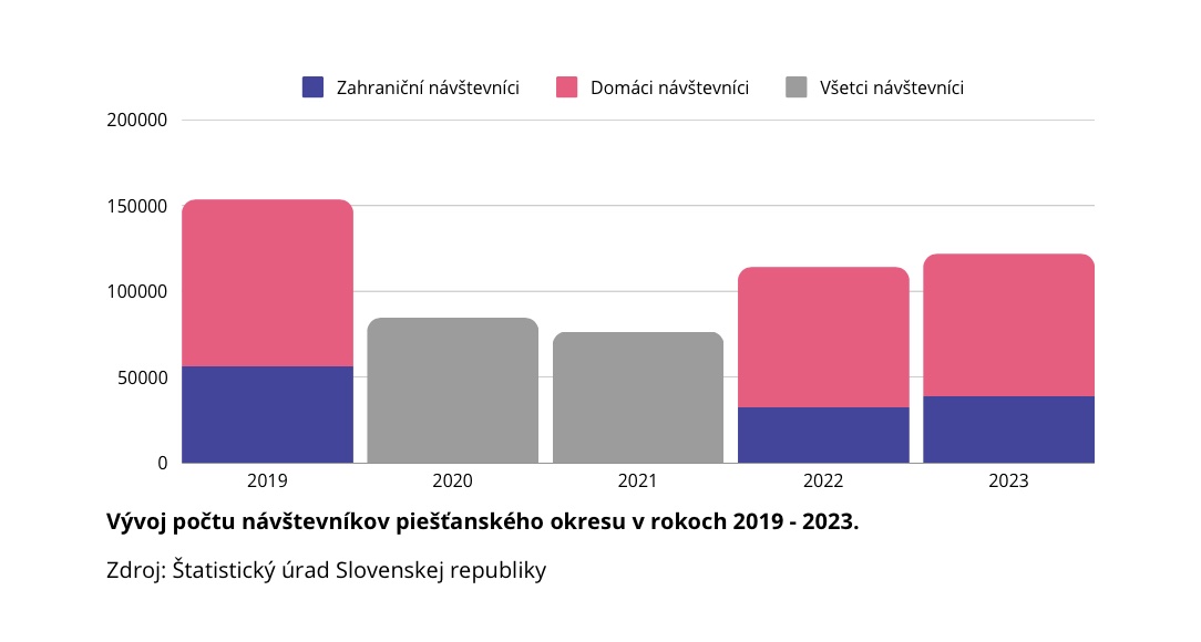 V roku 2023 sa ubytovalo v členských samosprávach viac ako 123-tisíc návštevníkov, čo je v porovnaní s predpandemickým rokom 2019 pokles o 8 percent, no v porovnaní s rokom 2022 ide o mierny nárast. Oproti roku 2022 prišlo aj k nárastu tržieb, pričom tržby zahraničných návštevníkov tvorili 44,63 percenta z celkových tržieb a tržby domácich návštevníkov 55,37 percenta z celkových tržieb okresu. „Keď si však porovnáme, že 68 percent zo všetkých domácich návštevníkov vytvorilo tržby vo výške 55,37 percenta a 32 percent zahraničných návštevníkov vytvorilo 44,63 percenta celkových tržieb, potom je zrejmé, že je dôležité orientovať sa i naďalej na zahraničné trhy, nakoľko do destinácie prinášajú viac peňazí,“ upozorňuje Michal Bezák, predseda predstavenstva Rezortu Piešťany.