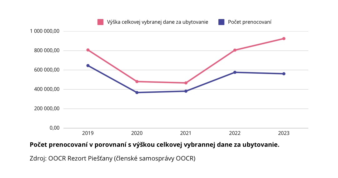 V roku 2023 strávili návštevníci v ubytovacích zariadeniach v členských samosprávach Rezortu Piešťany 561 444 nocí, čo je o 2,5 percent menej ako v roku 2022. Ak by sme mali porovnávať počet prenocovaní osôb nad 18 rokov, v takom prípade by bol medziročný prepad o 5,7 percenta, 18 366 prenocovaní vytvorili deti (osoby do 18 rokov). Deti platia daň za ubytovanie od 1.1.2023 a od tohto termínu ich mesto eviduje v štatistikách prenocovaní. Slovenské liečebné kúpele Piešťany a.s. tvoria až 61 percent z celkového počtu prenocovaní v členských samosprávach Rezortu Piešťany.