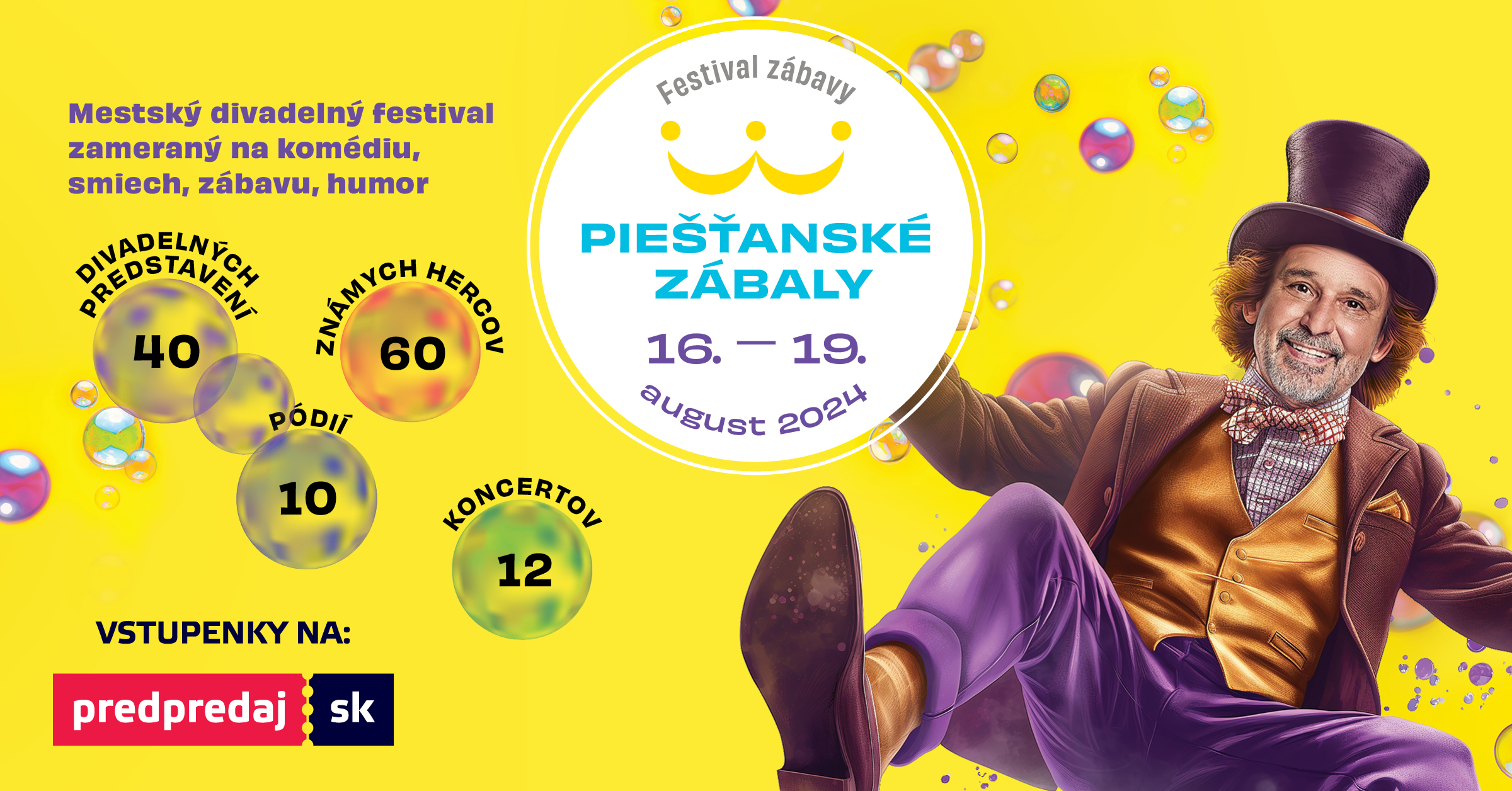13.8.2024: Unikátny festival Jozefa Vajdu láka do Piešťan všetkých, ktorí sa chcú zabaviť, pozrieť si najlepšie divadelné komédie, ale aj zábavné predstavenia pre najmenších. Mesto Piešťany ožije výnimočným festivalom s bohémskou atmosférou.